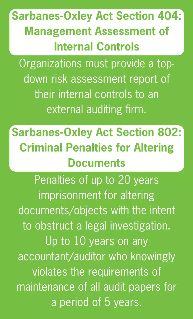 “SOX” is the most famous for Section 404. This section requires that companies implement internal controls to improve and maintain their ability to produce accurate financial statements. This is the most impactful way in which the Sarbanes-Oxley Act impacts businesses. Section 404 is what people are often thinking of when referring to the Sarbanes-Oxley Act. This section is a key part of how the legislation works. It underscores the importance of good records management practices, since all companies are at risk of penalties for non-compliance.
